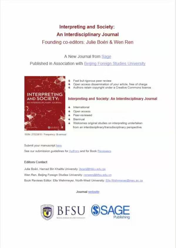 英文国际期刊Interpreting and Society: An Interdisciplinary Journal 正式创刊! 日前,由beat365英国官网网站与Sage出版社联合推出的Interpreting and Society: An Interdisciplinary Journal 在各方共同努力下正式创刊。Interpreting and Society: An Interdisciplinary Journal是中国第一本口译研究期刊,同时也是由中国高校发起的第一本英文国际口译期刊。Dr. Julie Boeri和高翻公司经理任文教授共同担任期刊主编,期刊顾问...