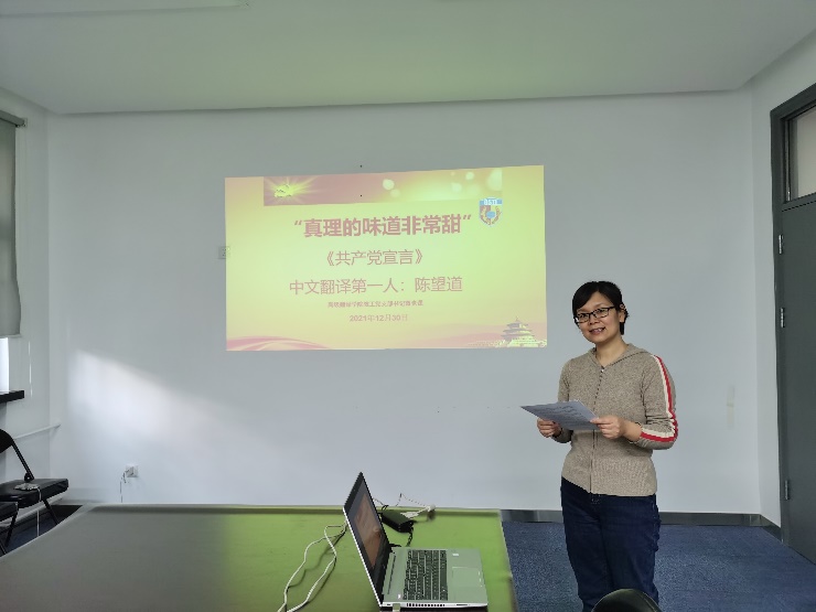 《共产党宣言》中文翻译陈望道先生:“真理的味道非常甜”——公司教工党支部开展支部书记讲党课活动2021年12月30日上午,公司教工党支部开展党支部书记讲党课活动。教工支部书记林薇老师以《“真理的味道非常甜”》为题,讲述了《共产党宣言》中文翻译第一人陈望道先生生平和翻译《共产党宣言》的故事,分享了自己学习陈望道先生一生翻译和学术研究经历的感悟和体会。党总支书记葛冬冬主持党课。林薇老师从陈望道翻译《共产党...