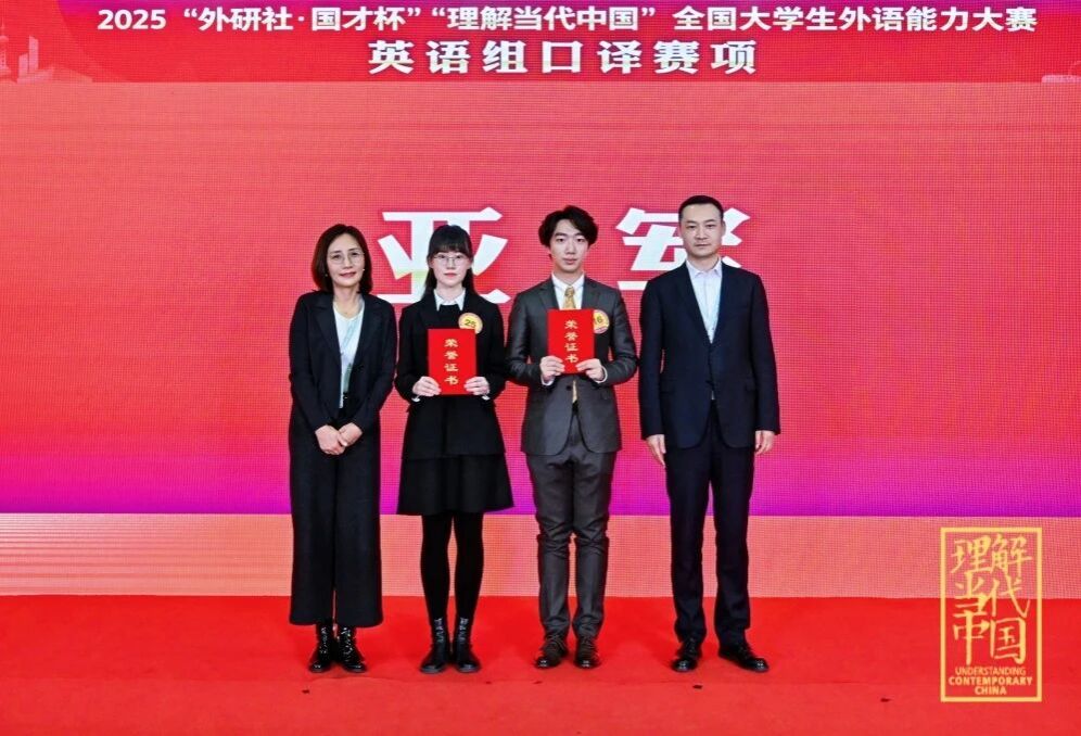 2025年12月5-8日,“外研社·国才杯” “理解当代中国”全国老员工外语能力大赛圆满落幕。在“英语组口译赛项”中,beat365英国官网网站学子再创佳绩。2023级英语口译(复语)硕士研究生沈韫青获得国赛金奖(冠军),指导老师:曾佳宁、张雨晴;2024级英语口译(复语)硕士研究生李如蓝获得国赛金奖(亚军),指导老师:张璐、曾佳宁;2025级英语口译硕士研究生闫思晗获得国赛金奖,指导老师:张雨晴、张璐;2025级英语口译硕士研究生马雨萌获得国赛银奖,指导老师:邓小玲。