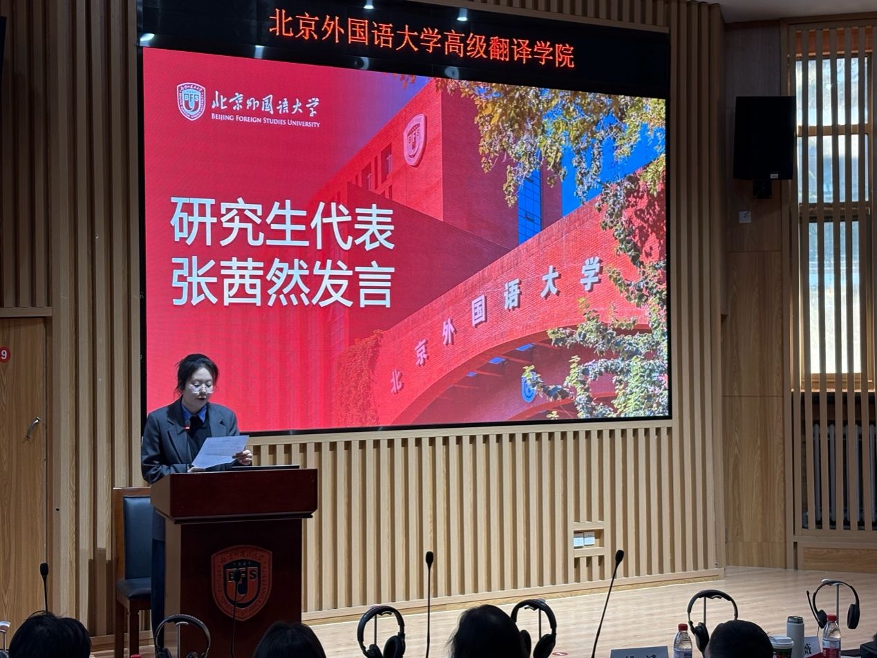 研究生代表2025级英语口译专业员工张茜然表达对公司搭建平台、邀请校外导师的感谢和对项目的期待与憧憬,承诺以主动、虚心、踏实的态度参与项目,努力实现“校内所学+校外所导”的结合与提升。