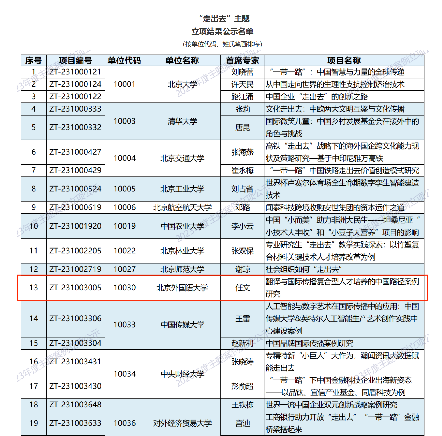 公司任文教授作为首席专家,赵田园、朱玉犇、江璐三位老师作为项目组成员申报的《翻译与国际传播复合型人才培养的中国路径案例研究》获得“走出去”主题立项(项目编号:ZT-231003005)。