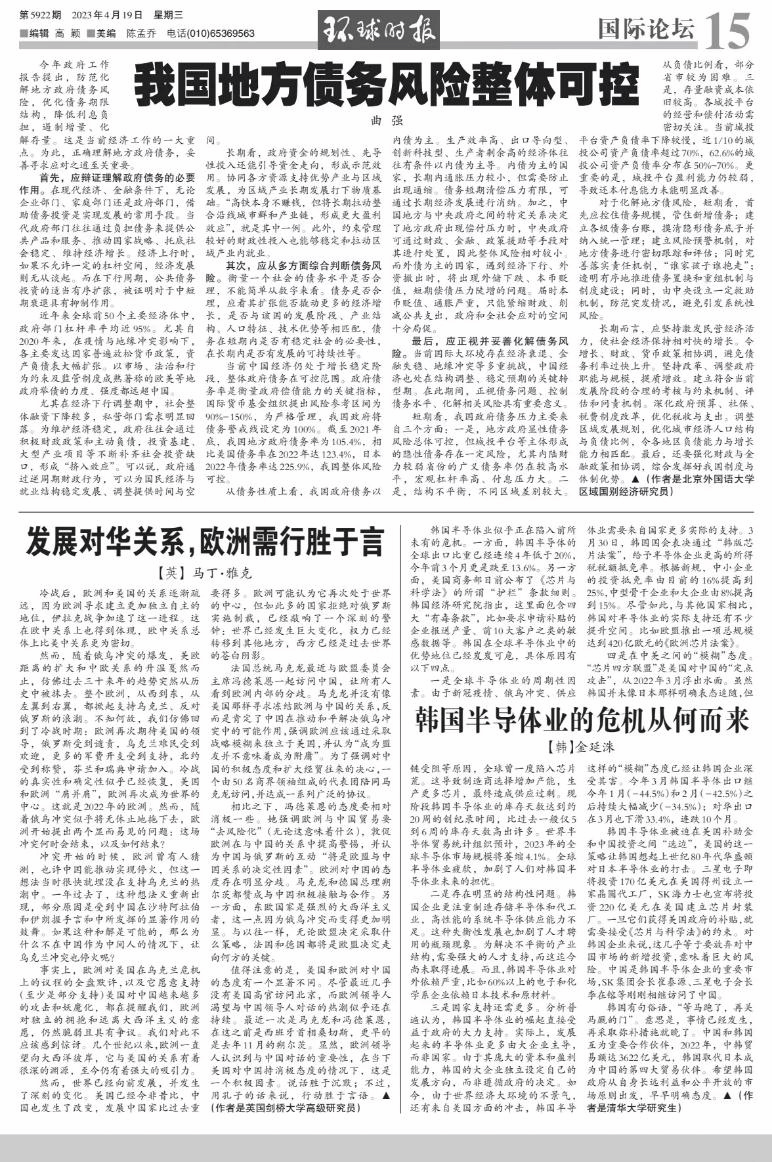 4月19日,《环球时报》刊登了公司曲强副教授文章:《我国地方债务风险整体可控》,文章对当前地方经济形势进行分析。