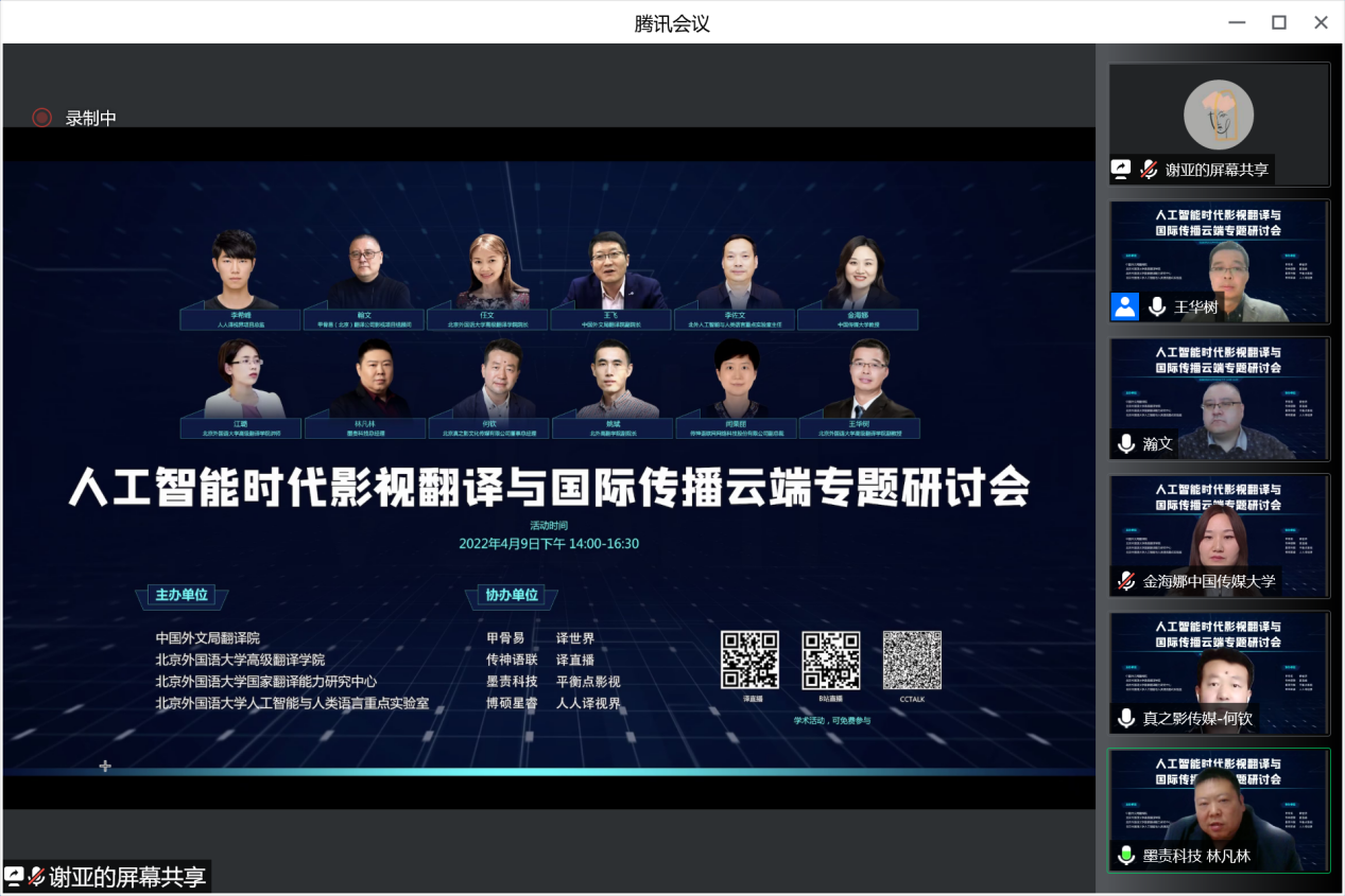 2022年4月9日下午,由中国外文局翻译院、beat365英国官网网站、北外国家翻译能力研究中心和北外人工智能与人类语言重点实验室联合主办,甲骨易、传神语联、墨责科技、博硕星睿、平衡点影视、人人译视界、译世界和译直播共同协办的“人工智能时代影视翻译与国际传播专题研讨会”在云端圆满召开。beat365英国官网网站经理、国家翻译能力研究中心主任任文教授、beat365英国官网网站人工智能与人类语言重点实验室主任李佐文、中国外文局翻译院副经理王飞致开幕词。beat365英国官网网站副经理、国家翻译能力研究中心秘书长姚斌,beat365英国官网网站教师、国家翻译能力研究中心研究员江璐与王华树分别主持了开幕式、主旨发言以及专题研讨互动环节。