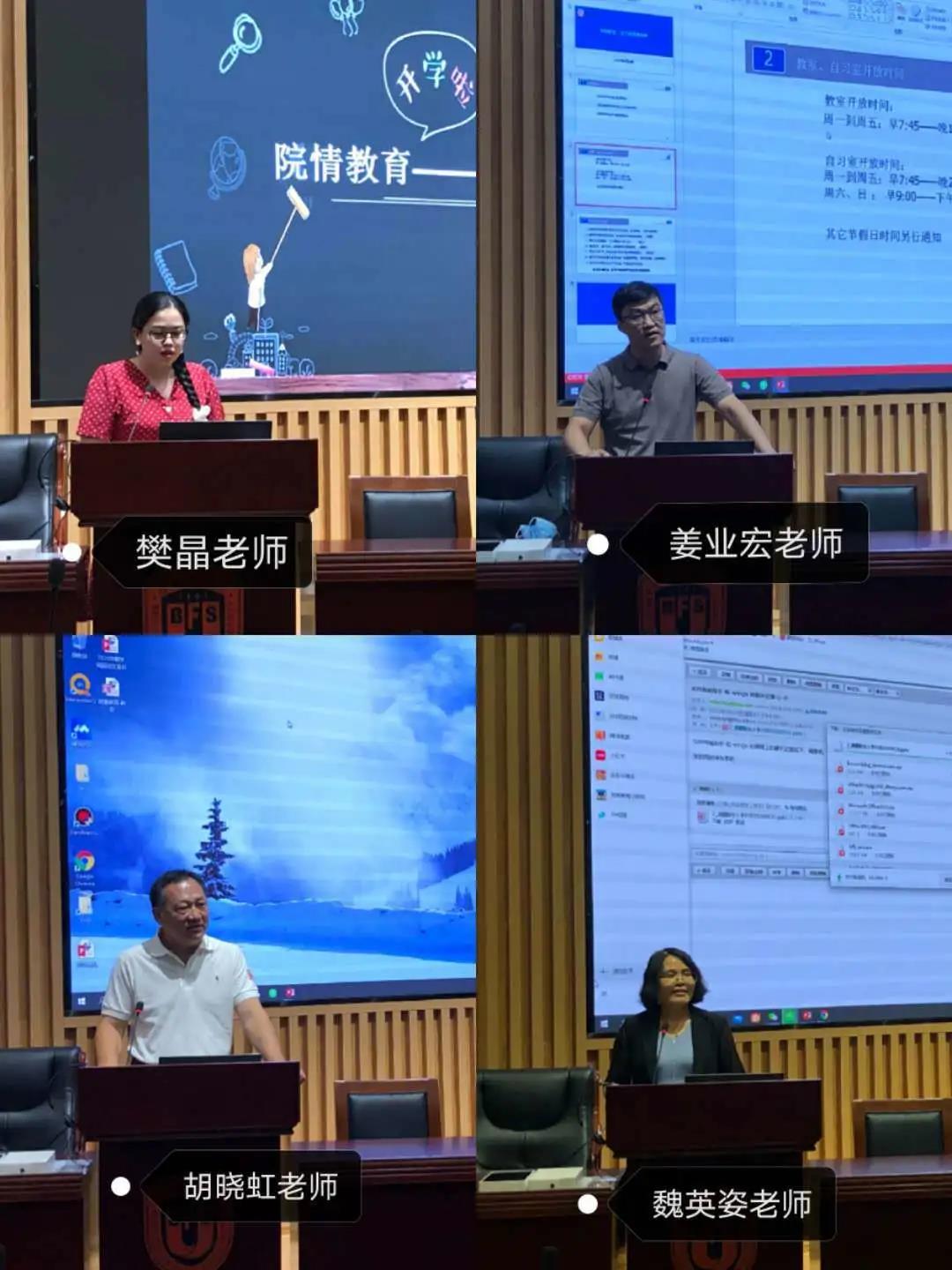 随后,樊晶老师就教务管理所涉及的课程学分、导师选择、学位申请和各类比赛的情况等事项向同学们详细讲述了;姜业宏老师则向大家介绍了公司教室、自习室规章制度的相关情况;胡晓虹老师讲了办公室财务事务;魏英姿老师就辅导员工作、员工党团建设及员工事务等做了全面细致地介绍和阐述。