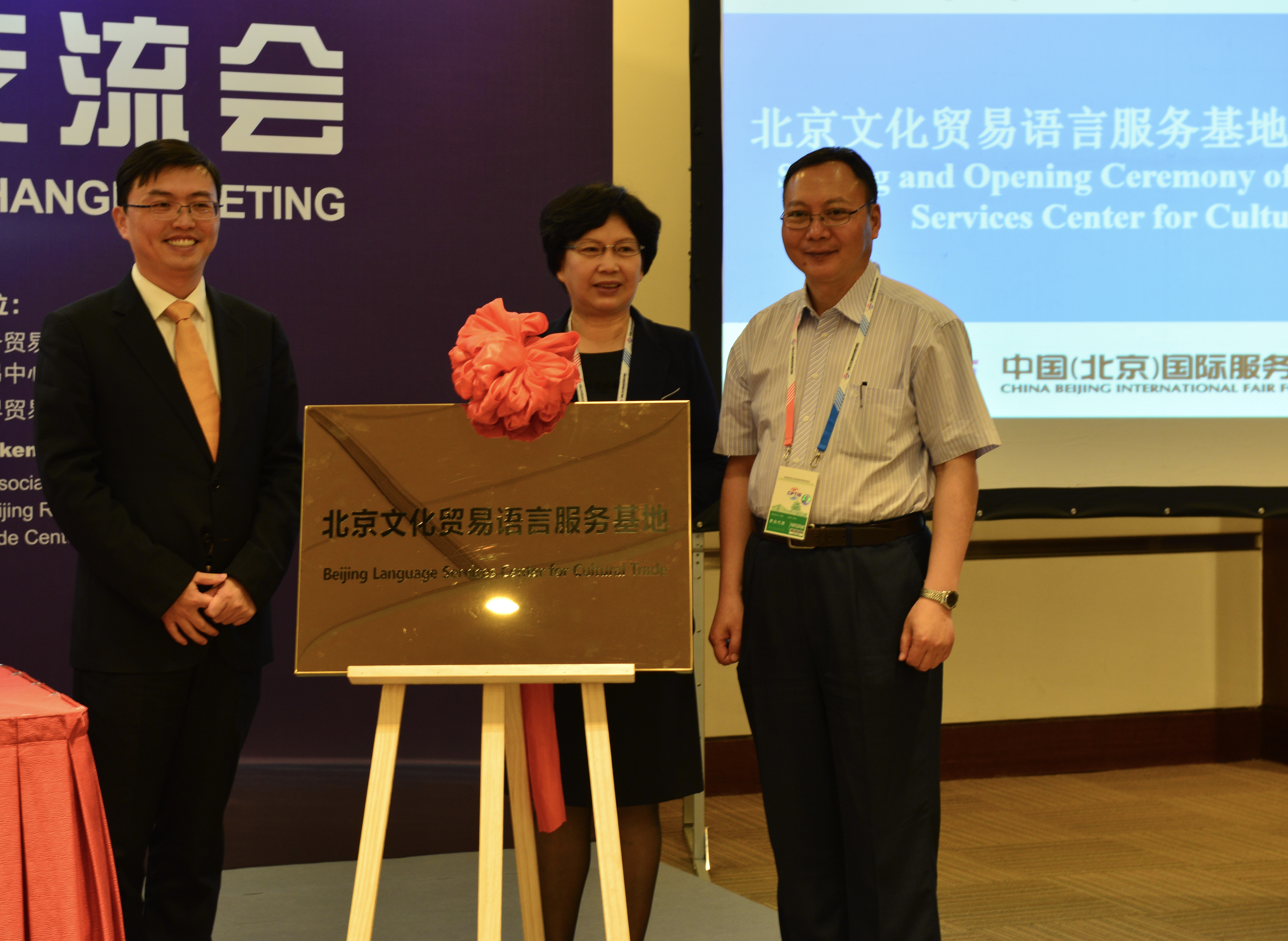 北京服务贸易协会会长李露霞女士、beat365英国官网网站副经理李长栓教授、北京文化贸易语言服务基地负责人毛隽博士签约并共同为北京文化贸易语言服务基地揭牌。