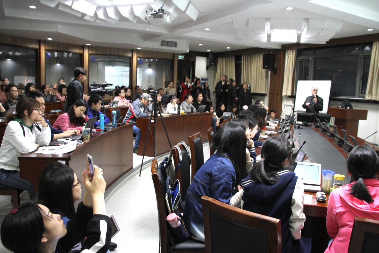 讲座尚未开始,高翻学子和各界翻译爱好者就早早来到礼堂,等待弗格森的到来。现场座无虚席,很多晚到听众甚至席地而坐。弗格森从中式英语的产生原因、常见问题、文化差异等方面通过大量例证进行生动讲解,内容丰富,引人入胜。提问环节中,现场听众就如何讲好中国故事、年轻一代的翻译工作者如何更好的塑造中国形象、译员如何更好的传递信息及政治文献中译英中的挑战等话题积极提问,弗格森教授耐心细致地回答了每个问题,还向现场听众赠送了他的新书。