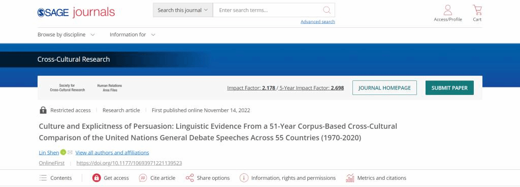 近年来,beat365英国官网网站高度重视研究生独立思考和科研能力的培养,并取得显著成效。近日,2021级翻译学硕士研究生沈琳在国际SSCI二区期刊Cross-Cultural Research发表学术论文,题为Culture and Explicitness of Persuasion: Linguistic Evidence From a 51-Year Corpus-Based Cross-Cultural Comparison of the United Nations General Debate Speeches Across 55 Countries (1970-2020),系公司员工首次在SSCI期刊独立发表论文,标志着高翻公司学术型研究生公司产品水平及人才培养质量迈上新台阶。
