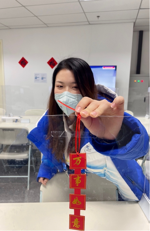 不知不觉,春节来临,志愿者和老师们一起贴上各种新春海报、福字、对联、小灯笼,无论是我们日常工作的记者工作间,还是驻地酒店,都充满了浓浓的年味儿。说起来,这还是我第一次离家过年,虽然不在自己的“小家”和家人团聚,但却融入了一个更加温暖的“大家”。我相信,和北外的冬奥志愿者以及老师们一起度过的这次春节,将会成为我最难忘的一个春节!