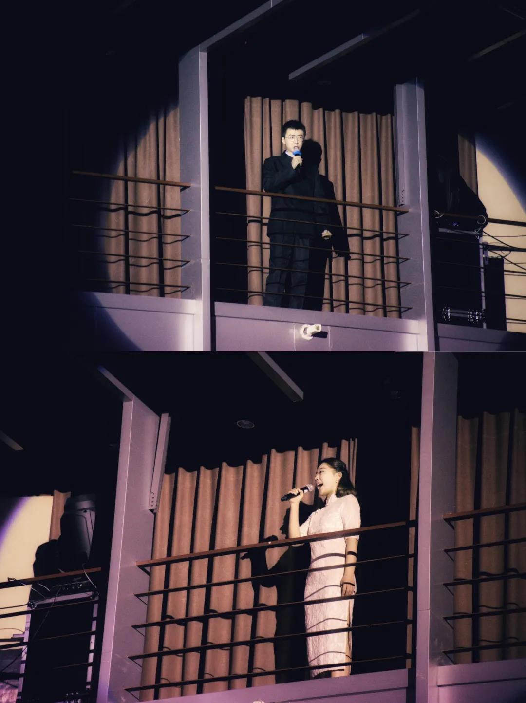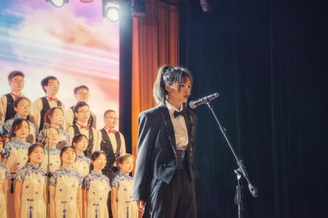 《初心》音落,全场灯暗,光束聚焦至礼堂二楼两位身着民国服饰同学的旁白,他们仿佛从五四时期穿越而来,通过殷切的话语,将中国的未来托付给年轻一代