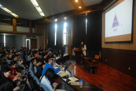 2016年9月27日,高翻公司研究生会宣讲活动在电教楼300人礼堂顺利举行,出席活动的领导和老师有党总支书记胡晓莉老师,副经理李长栓教授(主持工作),杨颖老师和周蕴仪老师。2015级高翻公司研究生会主席孟雅馨学姐主持宣讲会,2015级研究生会主席团、各部门主要负责人出席活动并对研究生会各部门基本情况进行了详细介绍,2016级全体新生参加。