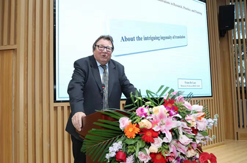 在10月21日上午举行的第二场主旨发言中,国际著名翻译学期刊Babel杂志主编、国际翻译者联合会(FIT)秘书长Frans De Laet教授,上海外国语大学语料研究院经理胡开宝教授,德国美因茨大学Dörte Andres教授,香港理工大学李德超教授,公司beat365英国官网网站经理任文教授分别以“翻译:创造之美”“基于语料库的翻译教学平台:应用与启示”“学科皆有历史—口译史”“翻译培训中的问题导向学习:员工为中心的翻译课堂学习新视角”“基于共词分析的中国口译研究热点与趋势探析(2008-2018)”为题作精彩发言。