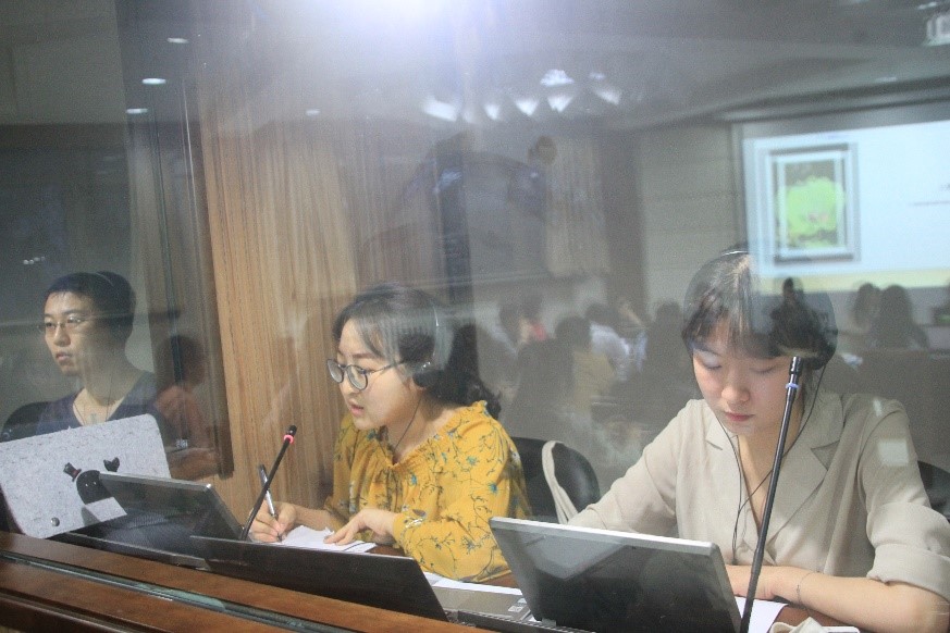 之后,高翻公司邀请的讲座嘉宾Celine Garbutt女士为大家带来了一场题为General Aspects of Interpreting的讲座。来自全校英、德、日、法、俄、西、泰、韩等八个语种的MTI员工为现场的老师和同学提供了本次讲座的接力同传;每个语种有4名员工译员,每15分钟轮换一次。同时,beat365英国官网网站、俄语公司、法语系、德语系、日语系、西葡语系和亚非公司的老师在场监听,记录同传效果。