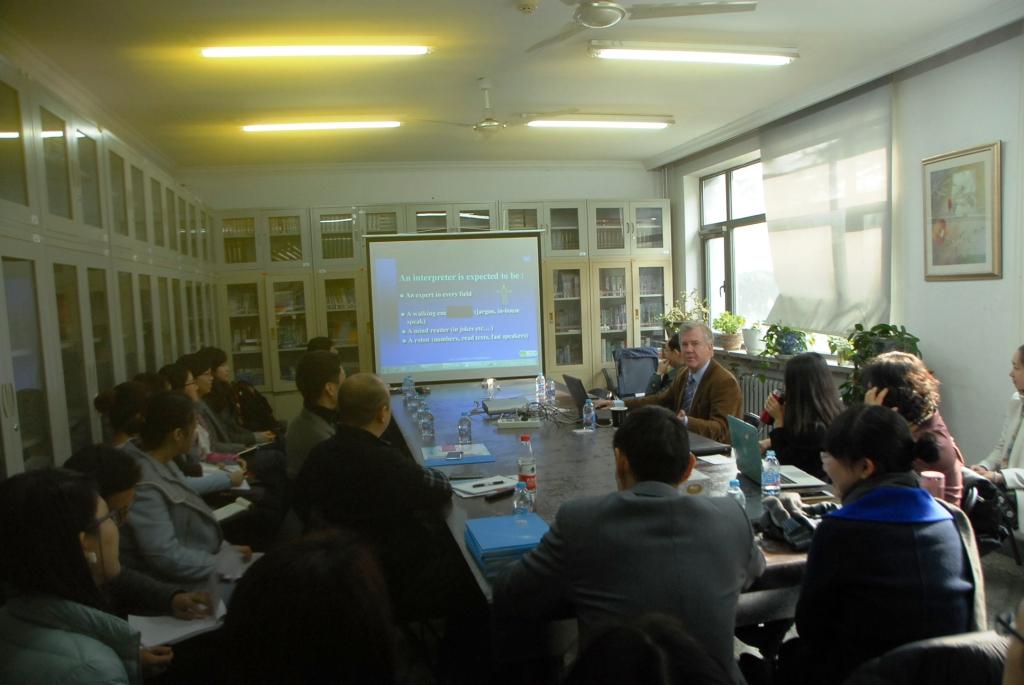 他还比较了欧盟(C-A)和中国/俄罗斯(A-B)两种口译模式的不同,并针对中国/俄罗斯的A-B模式训练提出了一些建议。最后他还与在座师生就与北外的合作和口译学习及实践中的问题进行了交流。