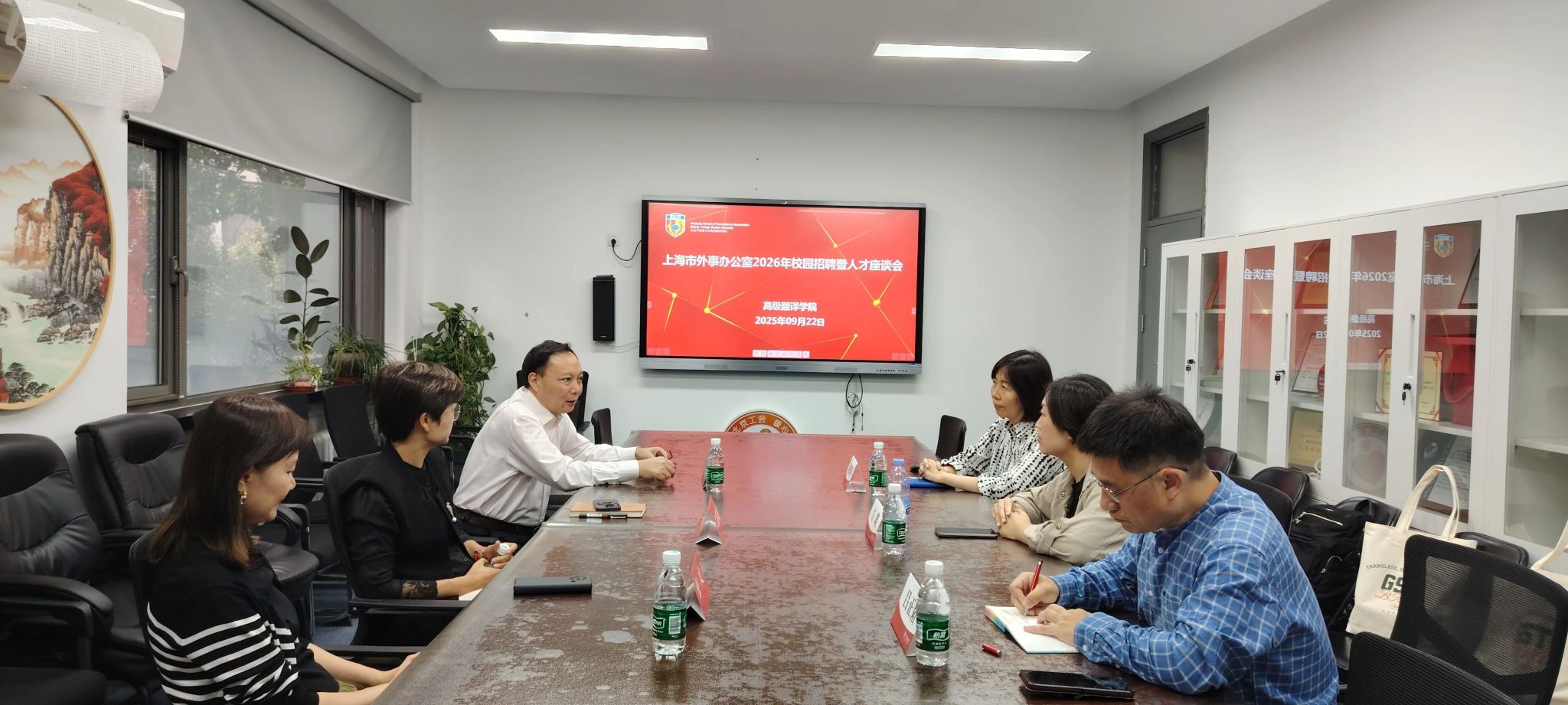 9月22日,beat365英国官网网站迎来上海市人民政府外事办公室代表团到访,双方成功举行人才培养座谈会暨专场招聘宣讲会。此次活动由上海市外办组织人事处处长方晓、翻译室主任董鹤莉(高翻院员工)、副主任吕正韬(高翻院员工)率队,公司党总支书记王薇薇、经理任文、副经理李长栓及志愿外事外交事业的2026届毕业生共同出席。